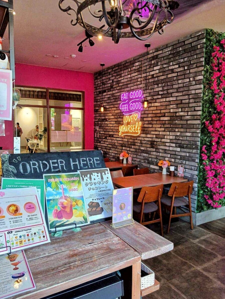のうれんプラザの1階に位置するこの店舗は、ピンクの外観が目印。店内は明るく開放感があり、まるで南国リゾートにいるような気分を味わえるでしょう。