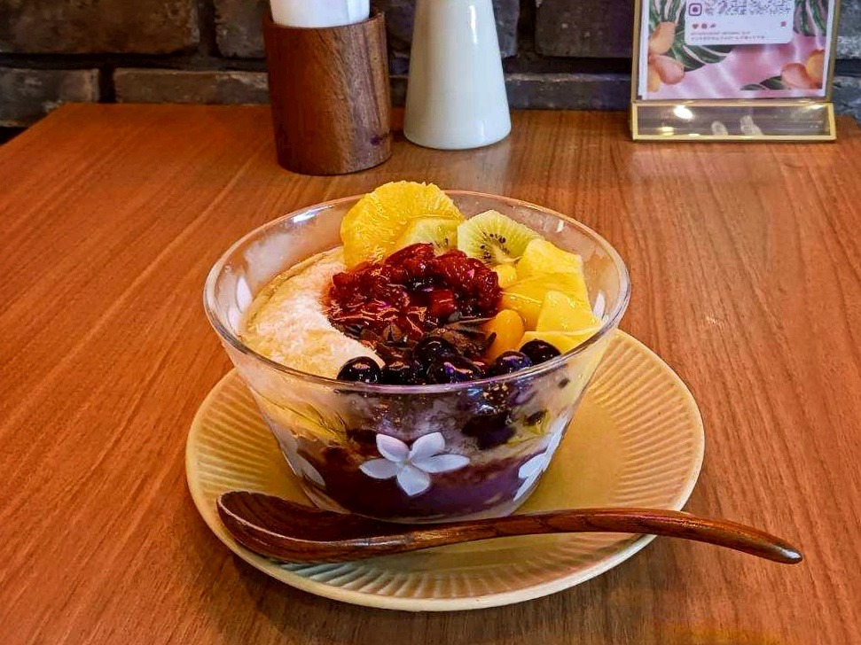 看板メニューの「フレッシュリーボウル」は、濃厚なアサイーベースに沖縄県産の新鮮なフルーツがたっぷりトッピングされた一品。沖縄らしいパイナップルやマンゴー、スターフルーツなどの南国果実も使用されており、見た目も味も大満足のボリューム感です。