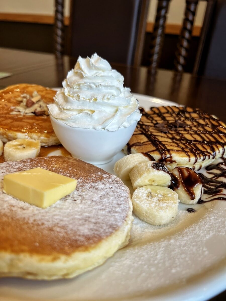 特に人気の「3 Flavorパンケーキ」は、たっぷりのチョコレート、塩キャラメルナッツ、プレーンバターの3つの味わいが一度に楽しめる贅沢な一品。