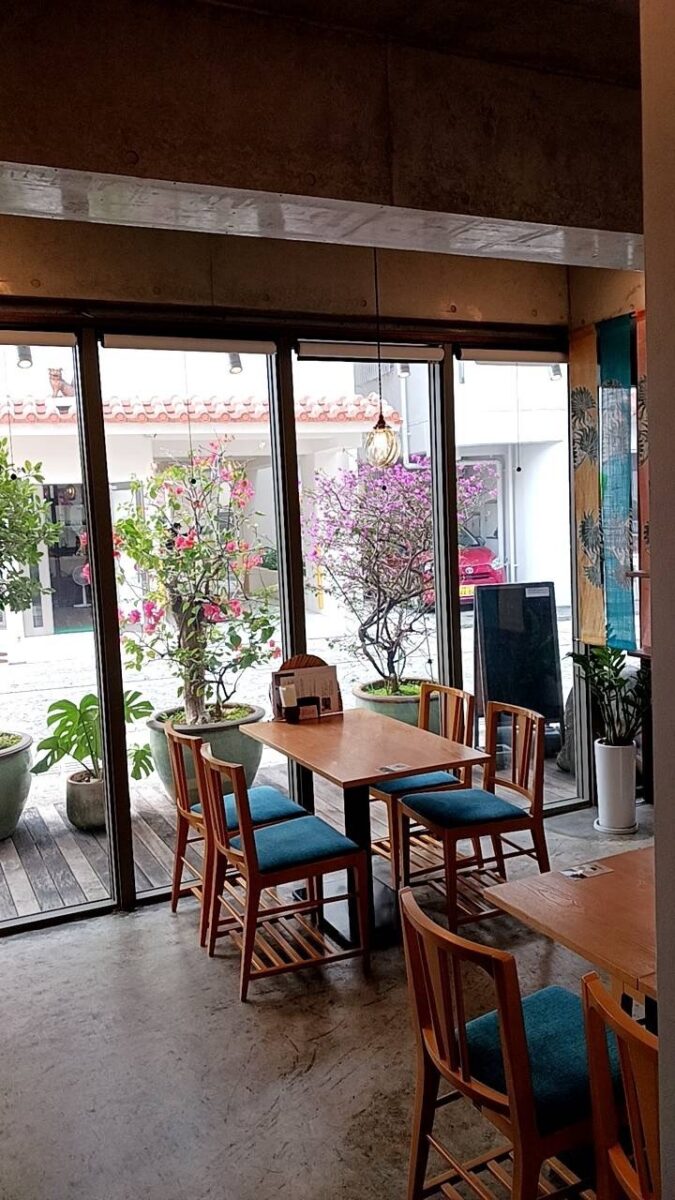 店舗は壺屋やちむん通りの石畳沿いに位置し、沖縄らしい赤瓦屋根の落ち着いた外観が目を引きます。店内は木材と陶器の質感が調和したアットホームな空間で、観光の喧騒から離れてゆっくり過ごせます。